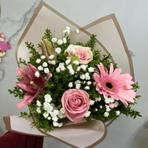 Ramo de 3 girasoles y 3 rosas papel rojo